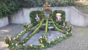 Eine Woche vor Ostern wird der Osterbrunnen aufgebaut. So lädt er auch in der Karwoche dazu ein, ihn als Ort der Ruhe zu besuchen und auf der Bank sitzend über den einen oder anderen Ostergedanken nachzusinnen.