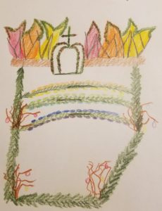Das Osterfeuer, an dem die Osterkerze entzündet wird – die brennende Kerze versinnbildlicht Christus als Licht der Welt. Der Regenbogen mit seinen bunt strahlenden Farben als Symbol für Gottes Bund mit den Menschen. Das Kreuz auf der Osterkrone. Es vereint Tod, Schuld, Frieden und Erlösung.