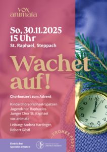 Traditionell findet in St. Raphael ein Adventskonzert mit den Chören von St. Raphael statt. In diesem Jahr ist das Ensemble VOX ANIMATA unter der Leitung von Robert Göstl am 1. Adventswochenende zu Besuch in Steppach und bestreitet einen großen Teil des diesjährigen Adventskonzert. Bereits am Samstag finden Workshops mit den Raphael-Spatzen, den Raphaelos und dem Jungen Chor St. Raphael. Das Ergebnis wird am Sonntag, 30.11. um 15 Uhr im Adventskonzert mit dem Titel „Wachet auf!“ unter der Leitung von Andrea Hartinger und Robert Göstl zu hören sein. Der Eintritt ist frei. Herzliche Einladung!