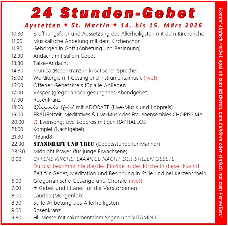 Am 14./15. März findet in Aystetten wieder das 24 Stunden-Gebet statt. Es startet am Samstag um 10:30 Uhr mit der feierlichen Eröffnung und dem Aussetzen des Allerheiligsten. Anschließend werden Gebetszeiten für verschiedene Anliegen, beispielweise...