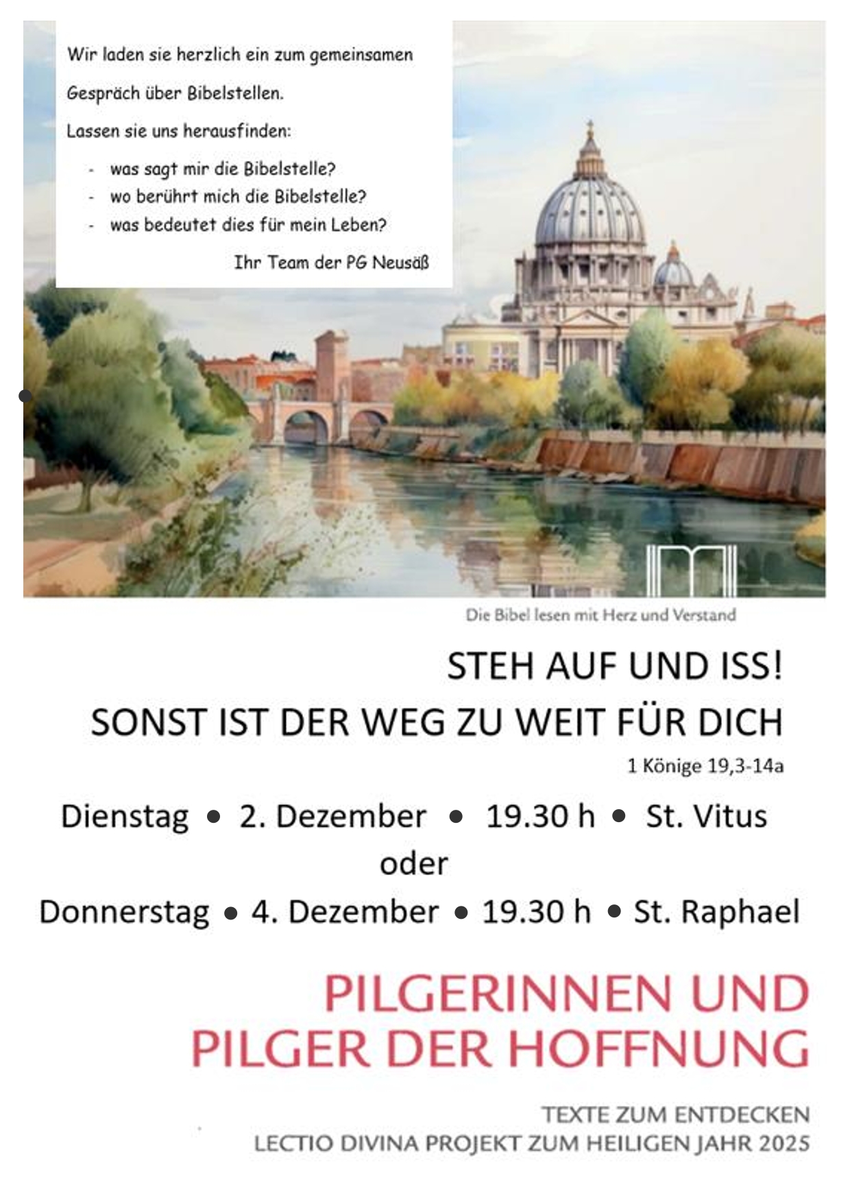„Pilgerinnen und Pilger der Hoffnung“ Bibel-Lesen im Heiligen Jahr Das Bibel-Lese-Projekt „Lectio divina“ gibt Ihnen Gelegenheit, die Bibel auf einem geistlichen Weg zu entdecken. Herzliche Einladung zum gemeinsamen Gespräch über Bibelstellen zum Thema Hoffnung....