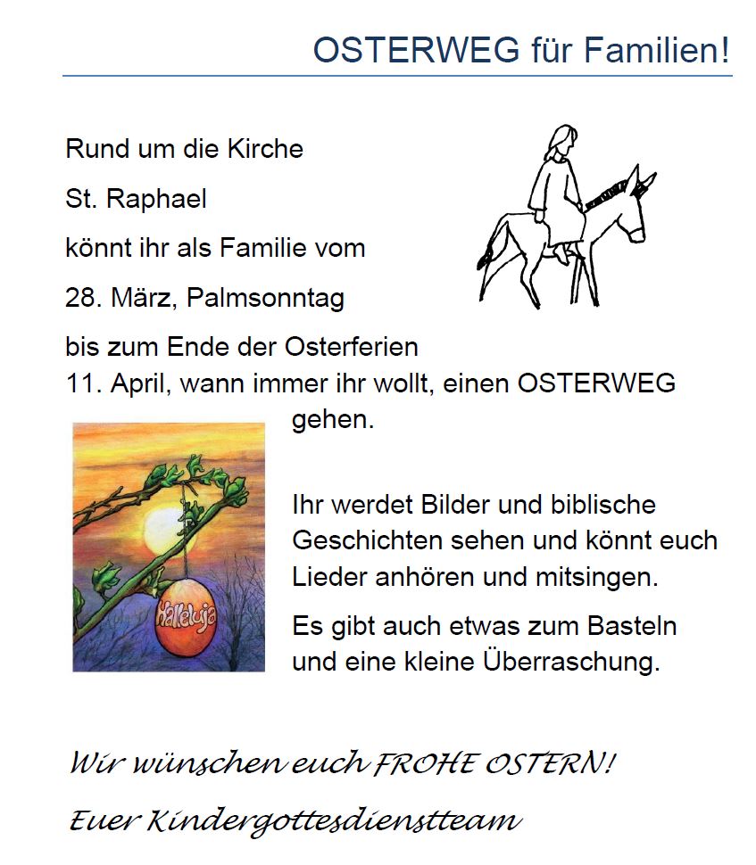 Osterweg für Familien, Rund um die Kirche St. Raphael könnt ihr als Familie vom 28. März, Palmsonntag bis zum Ende der Osterferien 11. April, wann immer ihr wollt, einen OSTERWEG gehen. Ihr werdet Bilder...