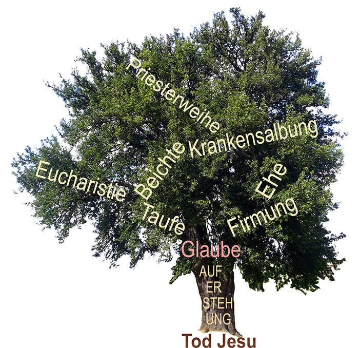 Die Bedeutung des Glaubens und der sieben Sakramente in Beziehung zum Heilshandeln Jesu kann man schön durch das Bild eines Baumes veranschaulichen: