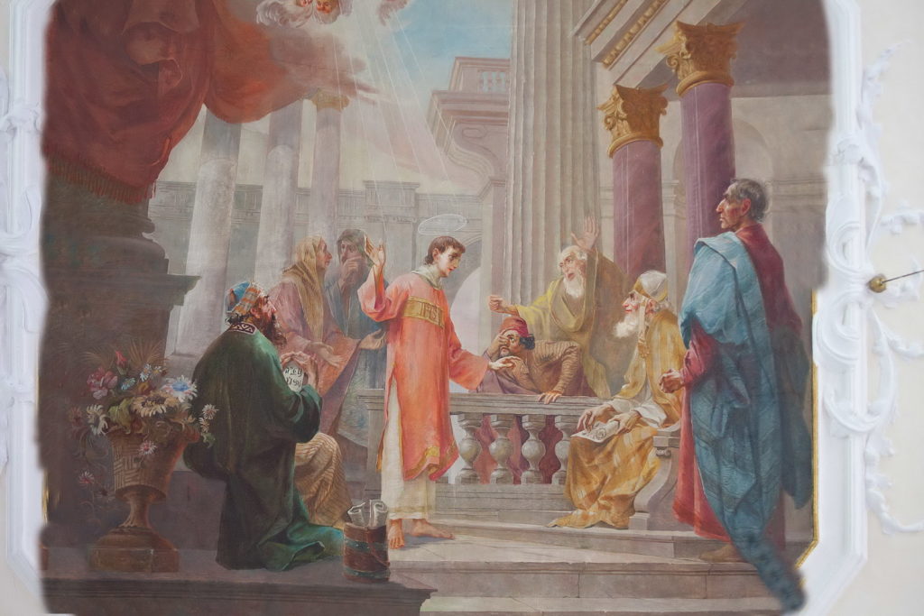 Eines der beiden Deckengemälde im Langhaus stellt Stephanus bei der Predigt dar. Der 26. Dezember, auch als Stephanstag bekannt, ist der Gedenktag des heiligen Stephanus, des ersten christlichen Märtyrers.