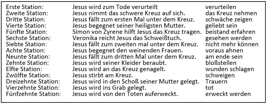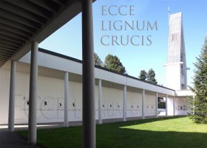 Der „neue“ Kreuzweg im Atrium der Vituskirche Im Rahmen der Sanierung des Atriums wurde 2010 der Kreuzweg neugestaltet. Gemeinsam mit der Künstlerin Frau Rist-Geiger wurde eine Lösung gefunden, die dem Betrachter einen Gesamtblick und im Detail ein zeitgemäßes Verständnis der Kreuzwegstationen erschließt. Große Lettern fassen den Kreuzweg ein und verbinden die 15 Stationen zu einem ganzen Bild. Mit dem Ruf – ECCE LIGNUM CRUCIS – („Seht das Holz des Kreuzes“) wird in der Karfreitagsfeier das Kreuz Christi der Gemeinde gezeigt. Das Kreuz, an dem Jesus den Tod erleidet, ist nach Ostern immer auch Siegeszeichen. Jesus hat nicht nur den Tod erlitten. Er hat ihn auch überwunden. Das Kreuz ist zum Hoffnungszeichen geworden. Die übergroße Inschrift im Atrium des Vituskirche ruft die Besucher der Kirche, sich auf diese Hoffnung einzulassen. Seit dem Mittelalter gibt es die geistliche Übung, den Kreuzweg zu gehen. Die einzelnen Stationen helfen, diesen Weg zu durchschreiten und die vielen Schichten im Kreuzweg Jesu auszuloten. In der Neugestaltung des Kreuzweges im Atrium der Vituskirche werden die Stationen nicht mit den klassischen Titeln benannt (z.B.: 1. Station Jesus wird zum Tod verurteilt.). Unter den Stationen ist in einem „Textband“ dieses Neue zum Ausdruck gebracht. Es bringt die menschlichen Erfahrungen ins Wort, die sich dann mit den einzelnen Stationen verbinden. Dieser Textband soll anregen den Weg der Stationen nachzugehen und die Situationen des Kreuzweges mit dem eigenen Erleben und Empfinden zusammenzubringen. Besonders reizvoll ist die Vorstellung, dass Leute, die im Alltag an der Kirche vorbeigehen, den Weg durch das Atrium wählen. Dort kann der Blick auf ein Wort aus dem Textband fallen: schwäche zeigen, beistand erfahren, vorausahnen, trauern. Das eigene Leben kommt so in Verbindung mit dem Geschehen des Kreuzweges. Es kommt zu einem heilenden Moment „im Vorübergehen“.