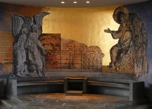 Die Wandgestaltung trägt den Titel „Christus- gestern – heute – und in Ewigkeit“. Besonders beeindruckend ist hier die große, vergoldete Fläche. Die Farbe „Gold“ steht in der christlichen Kunst für das ewige, unvergängliche Licht, das von Gott kommt. Das göttliche Licht berührt auf der rechten Seite die sitzende Person, dessen Hand in die Goldfläche hineinragt. Es ist Jesus Christus, erkennbar an seinem Heiligenschein mit Kreuznimbus. Neben ihm steht Johannes, der Seher von Patmos. Ihm wird das letzte Buch der Bibel zugeschrieben: die Offenbarung des Johannes. Die „Offenbarung“ bildet den biblischen Hintergrund der dargestellten Personen und Engel. Sie sind aus einer alten Darstellung übernommen worden. Jesus Christus, der auf dem Thron sitzt spricht von sich: „Seht ich mache alles neu. … Ich bin das Alpha und das Omega, der Anfang und das Ende.“ (Offb. 21,5f)
