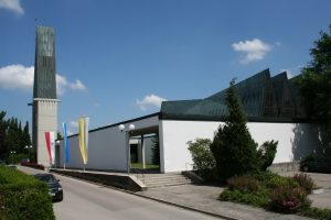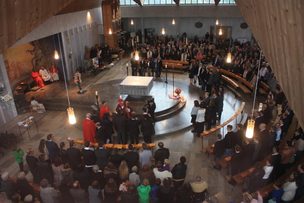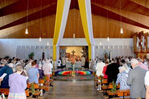 Am Dreifaltigkeitssonntag, den 11. Juni 2017 feiern wir zusammen mit Weihbischof Florian Wörner das 50. Weihejubiläum dieses Gotteshauses. Als Pfarrer habe ich in dieser Kirche schon viele schöne Gottesdienste feiern und besondere Erfahrungen machen dürfen. Der helle, weite Kirchenraum, der vormittags mit natürlichem Licht durchflutet wird, spricht die Menschen an. Durch die Anordnung der Kirchenbänke sind alle Mitfeiernden auf die Mitte hin ausgerichtet. In der Mitte steht der Altar – Sinnbild für Jesus Christus. An den Altarstufen versammeln sich die Gläubigen zum Kommunionempfang. Indem sie zur Mitte gehen, kommen sie sich gegenseitig näher. Hier wird deutlich: die Nähe zur Mitte, zu Jesus Christus, und die Nähe zu den Mitmenschen gehören zusammen.