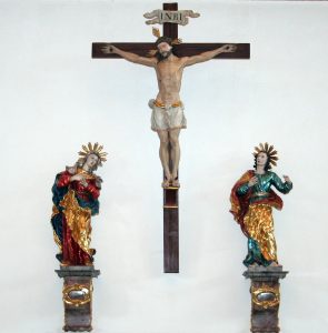 Die über den Eingang zur Sakristei angebrachte barocke Kreuzigungsgruppe aus dem 17. Jahrhundert, stammt aus der alten Vituskirche und war bis 2005 in der Apsis gehangen.