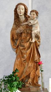 Auf einem Sockel mit dem jüdischen Glaubensbekenntnis „Höre, Israel, der Herr, unser Gott…“ steht eine spätgotische Marienstatue aus der alten Kirche.