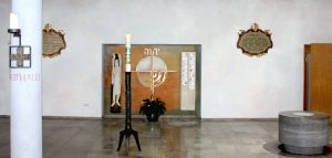 Sakristeitür, Altar und Apsis unserer Kirche liegen auf einer Linie. Wer die Kirche auf dieser Linie betritt, ist konfrontiert mit der alten Kirche in Gestalt der Kreuzigungsgruppe über der Sakristeitür. Keiner kommt am Kreuz vorbei. Es ist das Kreuz Jesu, das eigene und das der anderen. Darunter und dabei stehen zu bleiben, ist wesentlicher Teil der eigenen Geschichte und der unserer Mitmenschen. Der Altar ist beherrschend und einladend in der Mitte der Kirche aufgestellt, um eine Möglichkeit zu schaffen, sich um ihn zu versammeln.