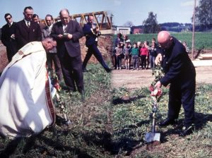 Vom ersten Termin der Ortsbesichtigung am 26.09.1961 bis zum ersten Spatenstrich am 21.05.1965 zogen sich die Verhandlungen mit der Gemeinde für den neuen Standort der St. Vituskirche auf dem Gelände „Hinterm Pfarrer“ hin. Die Planung des Kirchenneubaues wurde dem Architekten Karl Sendlinger, Westheim, übertragen, der sich im Wesentlichen an die Vorstellungen von Pfarrer Burkhart hielt. 21. Mai 1965 – Pfarrer Johannes Baptist Burkhart und der Direktor der Bischöflichen Finanzkammer, Domkapitular Johann Baptist Rigel vollziehen den ersten Spatenstich für die neue Vituskirche. Heute – 50 Jahre danach, erhebt sich die Vituskirche stolz über dem Schmuttertal. In den Broschüren der Stadt Neusäß und in Online-Verzeichnissen ist sie zum Wahrzeichen von Ottmarshausen geworden.