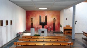 Die Himmelsrichtung „Osten“ weist hin auf Christus, den Auferstandenen: der „Priestersitz“ erinnert, dass Christus der Vorsteher der Gemeinde ist. Die Wandgestaltung zeigt uns die göttliche Zuwendung „Christus- gestern – heute – und in Ewigkeit“ macht SEINE Gegenwart sichtbar, die wir in der heiligen Feier und in der Ewigkeit.