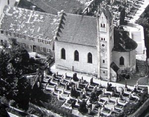 1. Kirchenbau im 9. Jahrhundert durch Grabungen nachweisbar. Die vorletzte Kirche überstand zwar den Dreißigjährigen Krieg, brannte jedoch im Jahr 1680 samt Pfarrhaus nieder. Das Schiff der wieder aufgebauten Kirche wurde 1840 abgebrochen, erweitert und erhöht. Mit dem Turm, der teilweise noch aus dem 12. Jahrhundert stammte, stand die Kirche (Bild oben) bis zu ihrer Sprengung, 31.10.1970. Der alte Pfarrhof aus dem Jahr 1683 wurde bereits Ende der fünfziger Jahre abgerissen. Kirchenpatron: zuerst St. Ottmar, ab Mitte des 18. Jahrh. St. Vitus.